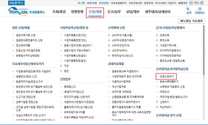 홈택스 사이트 상단 메뉴에서 신청/제출 - 근로장려금 간편신청하기 메뉴를 클릭해 신청하시면 됩니다.